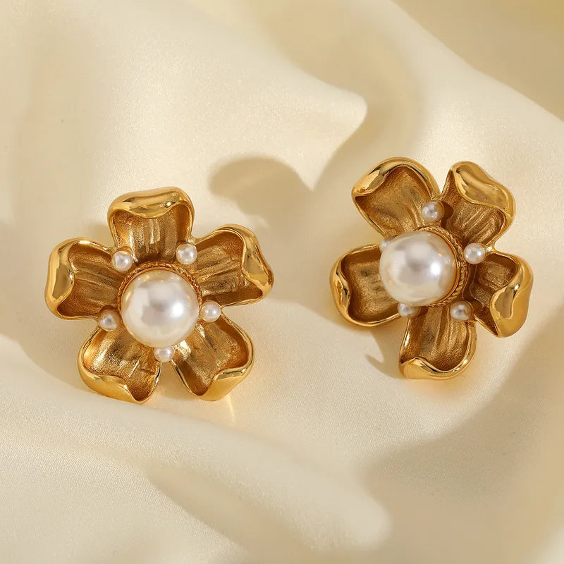 1 Pair Elegant Cute Retro Geometric Flower Plating Inlay 304 Stainless Steel Imitation Pearl 18K Gold Plated Ear Studs