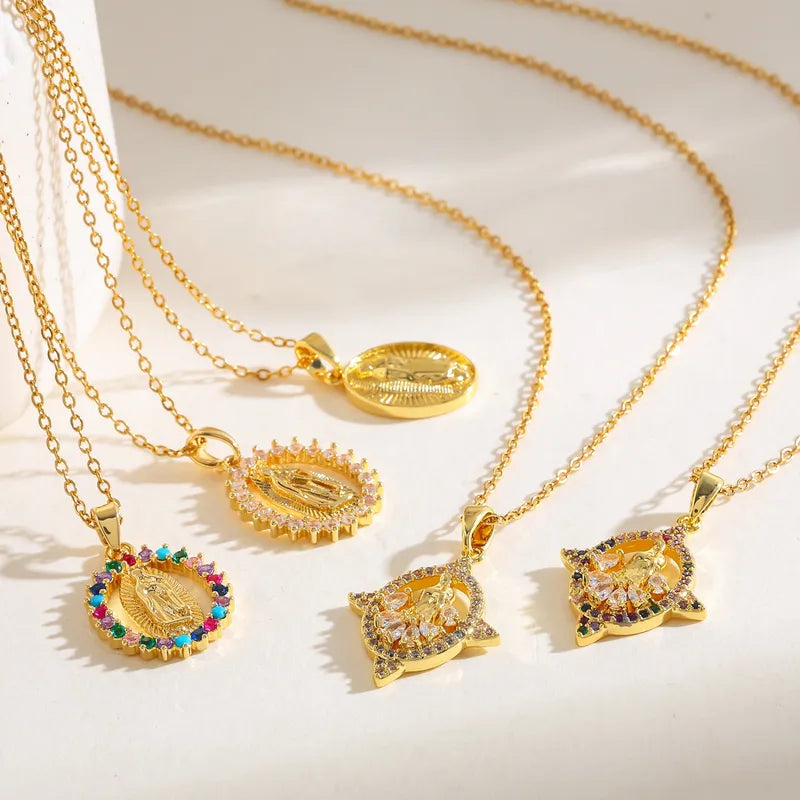 304 Stainless Steel 18K Gold Plated Zircon Vacuum Electroplating (Furnace) Water Plating Virgin Mary Oval Religious Copper Pendant Elegant Retro Simple Style Necklace
