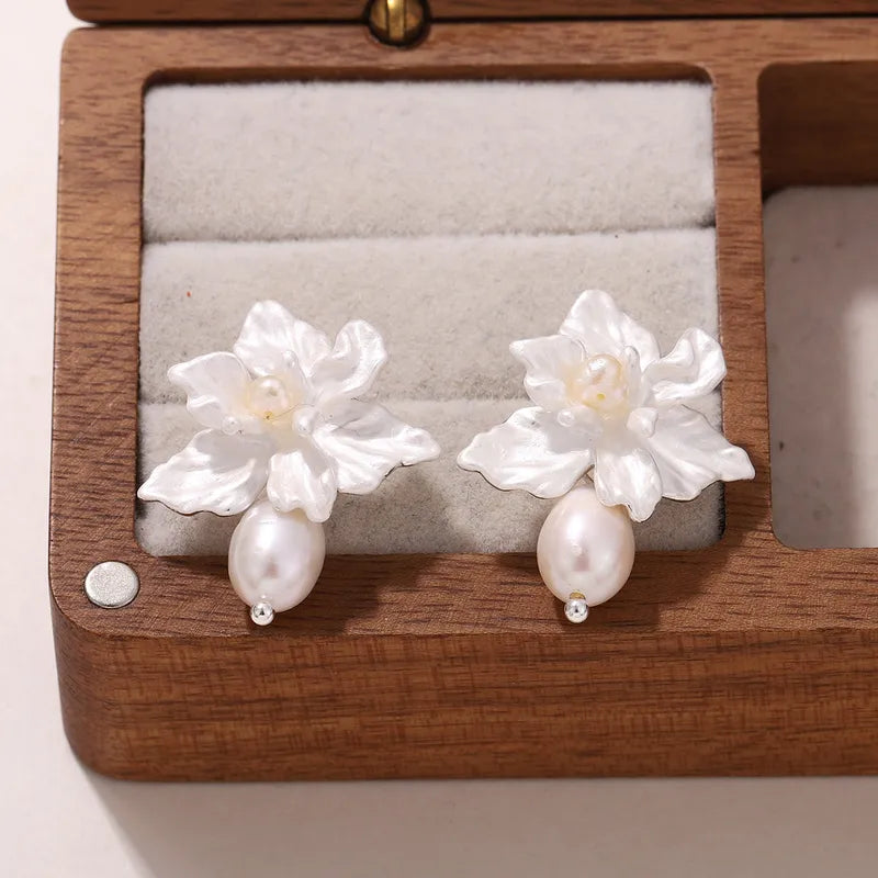 925 Sterling Silver Needle Copper Plated Bright Silver Flower Freshwater Pearl Drop Earrings Women Casual Holiday Jewelry