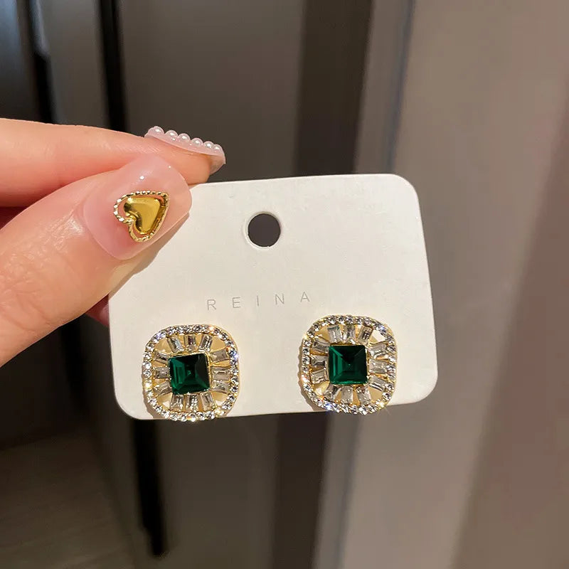 Green Zircon Flower Geometric Earrings Versatile Luxury Sensation French Vintage Style Four-sided Oval Shaped Women's Jewelry