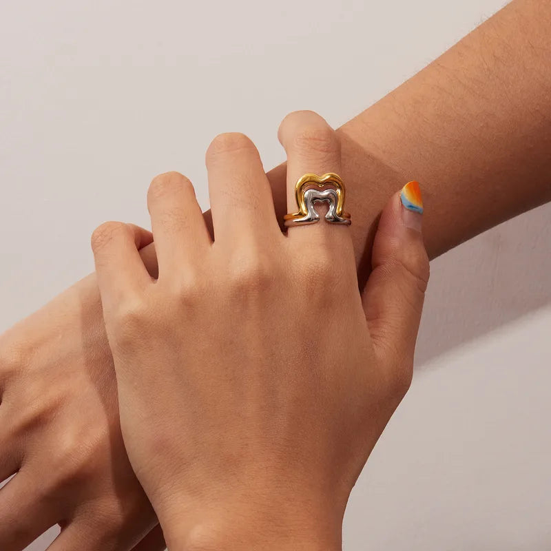 Ladies Romantic Sweet Open Ring 18K Gold Stainless Steel Gold And Silver Color Block Heart Hollow Out Adjustable Ring For Travel