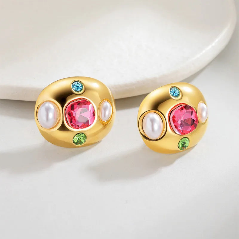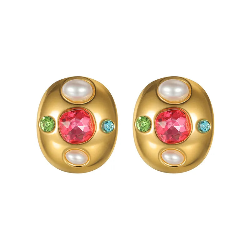 Oval Geometric 18K Gold-plated Stainless Steel Stud Earrings, Inlaid With Zirconia, Suitable For Women