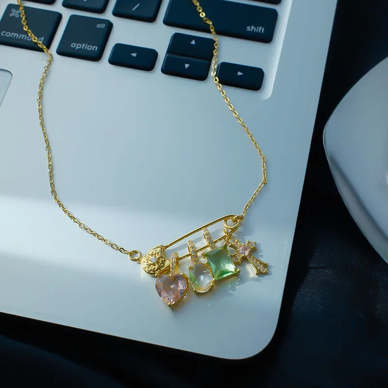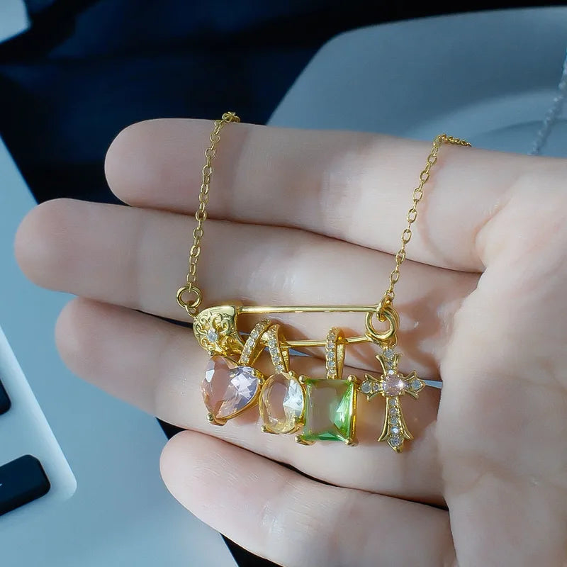 Sparkling Diamond Cross Pin Necklace For Women Unique Temperament Heart Pink Diamond Candy Color Silver-Plated Copper Choker