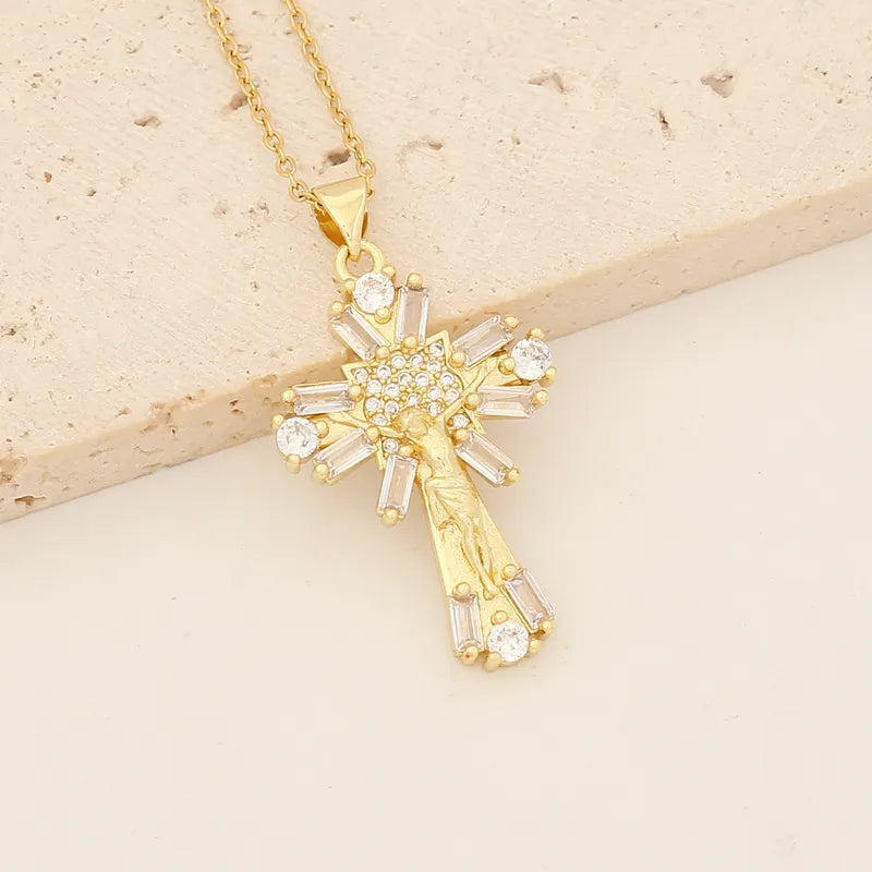 Wholesale Retro Classic Style Cross Round Flower Stainless Steel Copper Inlay 18K Gold Plated Zircon Pendant Necklace